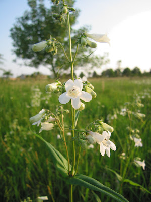 Penstemon digitalis (Snapdragon family - Scrophulariaceae). Most common species of the genus in Iowa. Smooth, shiny plants up to 4 feet tall. Leaves opposite, widest near their heart-shaped bases. Grows in prairies, rich woodlands and roadsides. Found throughout the tallgrass reagon. Also cultivated. Native to North America. Blooms late spring to midsummer.