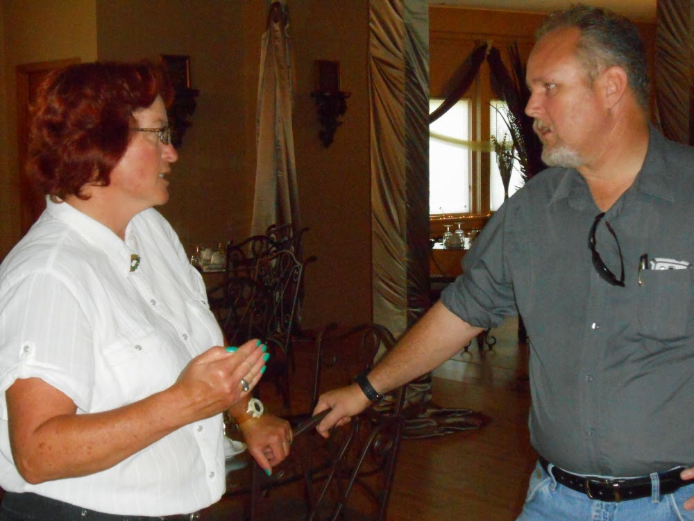 Here's Tina (left) visiting with Linda in the tearoom's reception area (above) and Teresa visiting with Scott (below). Teresa, by the way, is a cousin. And for all the other Miller cousins out there, here's how it goes: Teresa's mom was Mary Elizabeth (Feight) Buckalew/Hockart; Mary Elizabeth's mother was Mary (Abrahamson) Feight; and Mary's mother was our great-aunt, Cynthia (Miller) Abrahamson.