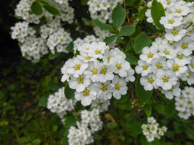 Elsewhere, there are a few heirloom rather than hybrid varieties --- smaller but no less colorful. And since spirea tends to bloom with irs, these shrubs are coming into full bloom, too, right now.