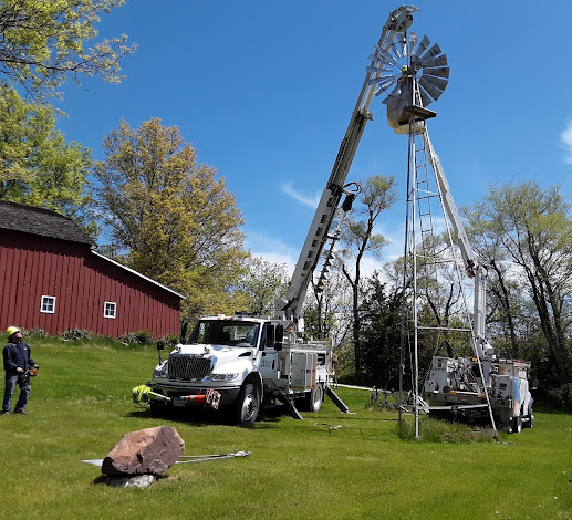 Board members Mike Smith and Jim then worked with Alliant to bring two big trucks to the campus on Wednesday to raise the base, then lift the fan and the tail --- both of which had been in storage --- into place and secure them. Many thanks to everyone involved!