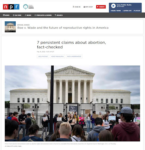 I was interested in this article, "7 persistent claims about abortion, fact-checked," from National Public Radio on Friday. Among the facts that emerge: Roughly 6 in 10 Americans believe that abortion should be legal in most cases.